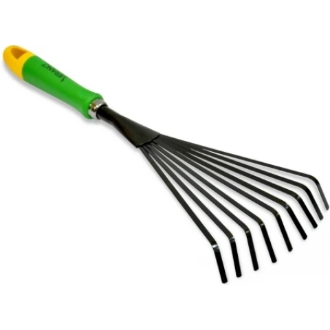 Садові віялові грабельки з вуглецевої сталі з захистом від корозії довжиною 140 мм шириною 130 мм. На кінці міцної пластикової ручки є кільце для кріплення ремінця. Добре себе зарекомендували на прибиранні газонів, особливо місць з обмеженим доступом. Візуально такі граблі нагадують мітлу, а їх пластинчасті зубці для зручності використання зроблені м'якими, еластичними і пружними. У процесі роботи вони не ушкоджують дерен, але при цьому ефективно збирають опале листя, сухі гілки, скошену траву і бур'яни, дрібне сміття. У густій траві вони не заплутуються, листя не нанизується. Вузькі віялові грабельки ідеально підходять для догляду за квітником і ягідними грядками.