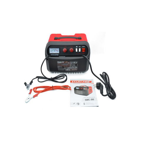 Пуско-зарядний пристрій START PRO SBC-30 переносное однофазное устрйство для бытового применения , предназначен для пуска двигателя и зарядки свинцово кислотных аккумуляторов на 12В / 24 В. Небольшая конструкция работает от однофазной сети 220 В и имеет размеры 260 х 230 х 210 мм и малый вес 8.0 кг, что позволят легко перемещать аппарат и разместить даже в маленькой мастерской. А для удобной транспортировки и переноса инструмента, предусмотрена пластиковая ручка на корпусе. В данной модели включены защита от перегрузки и изменения полярности. На панель прибора выведены ряд опций: функция быстрой зарядки Boost- помогает за короткое время подзарядить севший аккумулятор, регулятор настройки силы тока,циферблат амперметра отражает параметры силы тока. Данная модель может заряжать сразу несколько батарей, для этого надо использовать параллельное либо последовательное соединение.
