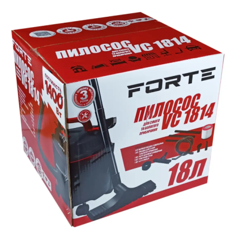 FORTE VC1814 — господарський пилосос, призначений для пиловидалення при роботі різного електроінструментом і для прибирання будівельних майданчиків. Відмінністю від звичайних побутових пилососів є можливість прибирати вологий і об'ємний сміття не тільки в житлових приміщеннях, але і на великих територіях, будмайданчиках, присадибних ділянках. Дана модель дозволяє зібрати велику кількість відходів, завдяки баку на 18 л. Оптимальна ефективність двигуна становить 1400 Вт при силі всмоктування 17 Кра. Дана модель також має функцію побутового пилососа, які можна реалізувати за допомогою додаткових насадок.