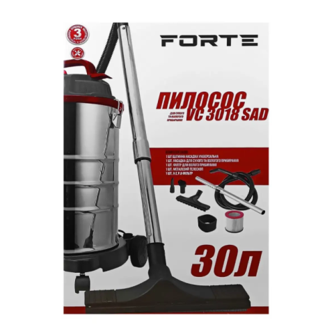 Forte VC3018SAD — універсальний будівельний пилосос, який характеризується чудовою якістю складання. Він успішно застосовується у процесі прибирання житлових приміщень від пилу та бруду, а також може бути використаний у гаражах, підвалах, виробничих приміщеннях та на присадибних територіях.
