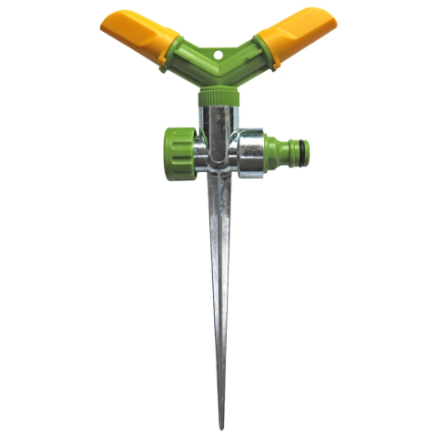 Розпилювач круговий на 2 сопла з пластика ABS+PP на цинковому стрижні використовується для зрошення газонів середньої та невеликої площі, підійде для поливу городу. Він розбризкує воду тонкими струменями, імітуючи природний невеликий дощ, і обробляє сектор ділянки захопленням 360 °. Підключається до садових шлангів за допомогою конекторів. Рекомендований робочий тиск в системі від 2 до 4 атмосфер. Довговічний, стійкий до впливу ультрафіолету і водорозчинних добрив. Простота установки, висока ефективність і рівномірність поливу, збереження оптимального рівня вологості грунту і повітря. Інструкція по монтажу: підключити садовий шланг через кран до джерела водопостачання, за допомогою конектора підключити шланг до розпилювача, встановити розпилювач на місце поливу, подати воду в систему.