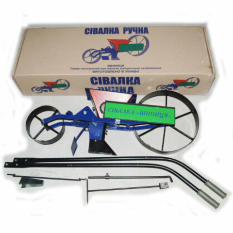 Сівалка ручна - призначена для пунктирного і гніздового посіву насіння овочевих і баштанних культур, таких як огірки, томати, буряк, цибуля, редиска, морква, кавуни, дині. Можливий рядний (насіння розміщуються в грунті безперервно) і гніздовий посів (насіння розміщуються в грунті на певній відстані). Характеристики: Габарити (ДхШхВ) (без ручок): 1080х190х340 мм Тип: Однорядна Маса: 7,5 кг. Діаметр колеса трамбовочного: 160 мм Діаметр веденого колеса 320 мм Об'єм ящика для насіння: 2,5 дм3 Тип висівного апарату: Щітковий Тип приводу: Ланцюговий Максимальна ширина міжрядь 45см Максимальна глибина посіву: 5см